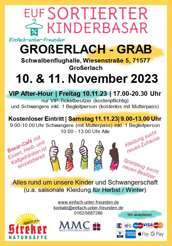Am 10.11.23 von 17-20.30Uhr und 11.11.23 von 9-13Uhr findet der sortierte Kindersachen Basar nach dem Motto ‚Einfach-unter-Freunden‘ ein weiteres Mal in der Schwalbenflughalle in der Wiesenstrasse 5 in 71577 Großerlach-Grab statt.